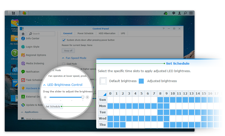 DS216j 配備可調(diào)整亮度的 LED 指示燈,讓你可以針對前方面板的 LED 燈進(jìn)行四種明暗度及排程設(shè)定,根據(jù)所處環(huán)境決定舒適的亮度。